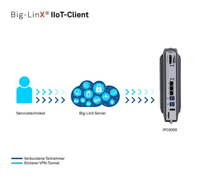Bezpieczny zdalny serwis możliwy jest przy stosowaniu technologii klient IIoT Big-LinX® do połączenia tunelem VPN zabezpieczony kartą lub certyfikatem programowym . X-Remote umożliwia zdalne sterowanie oraz duplikację interfejsu użytkownika – bez względu na czas i miejsce na całym świecie. Do dyspozycji jest platforma Big-LinX ze zdalnym zarządzaniem dowolną liczbą urządzeń końcowych.